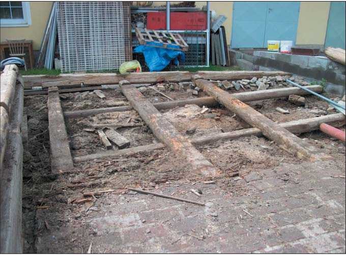 Pohled do odkryté podlahy objektu s roštem z povalů