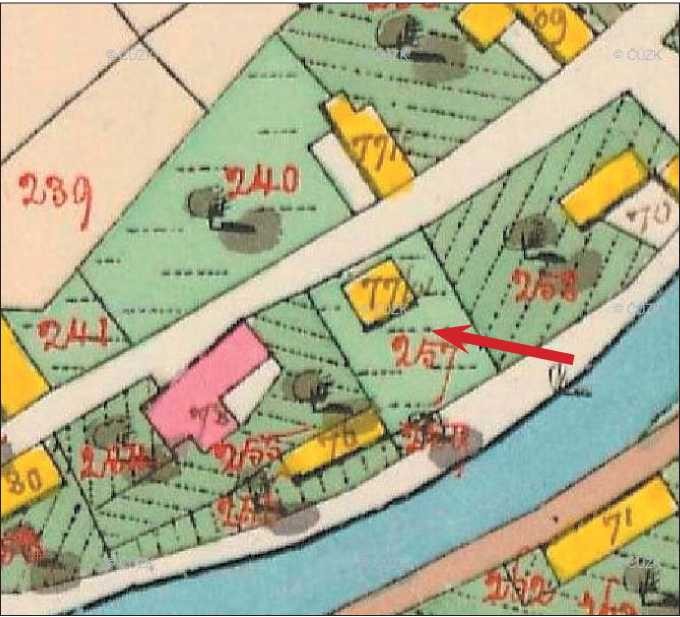 Výřez z mapy stabilního katastru z r. 1840. Stav v Kvasinách. Šipkou označen transfer (77/2) a mateřská usedlost čp. 92 (77/1). Domek čp. 132 v této době ještě nestál