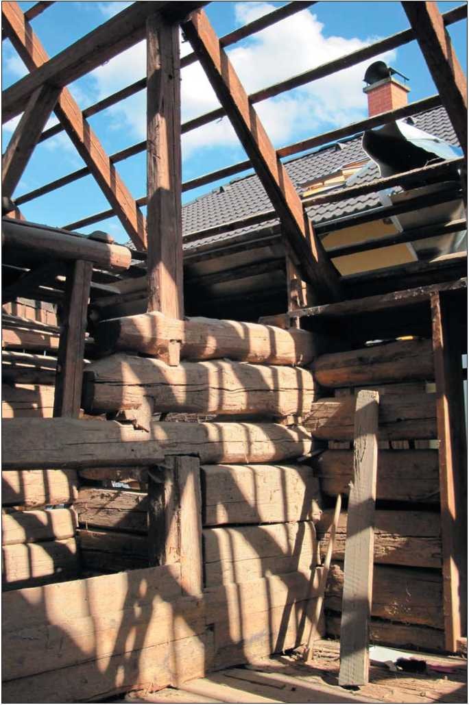 původního otvoru, včetně vstupu pro psa, byl zarouben materiálem pocházejícím z odřezků samotné stavby a částečně i ztesaným novým materiálem.